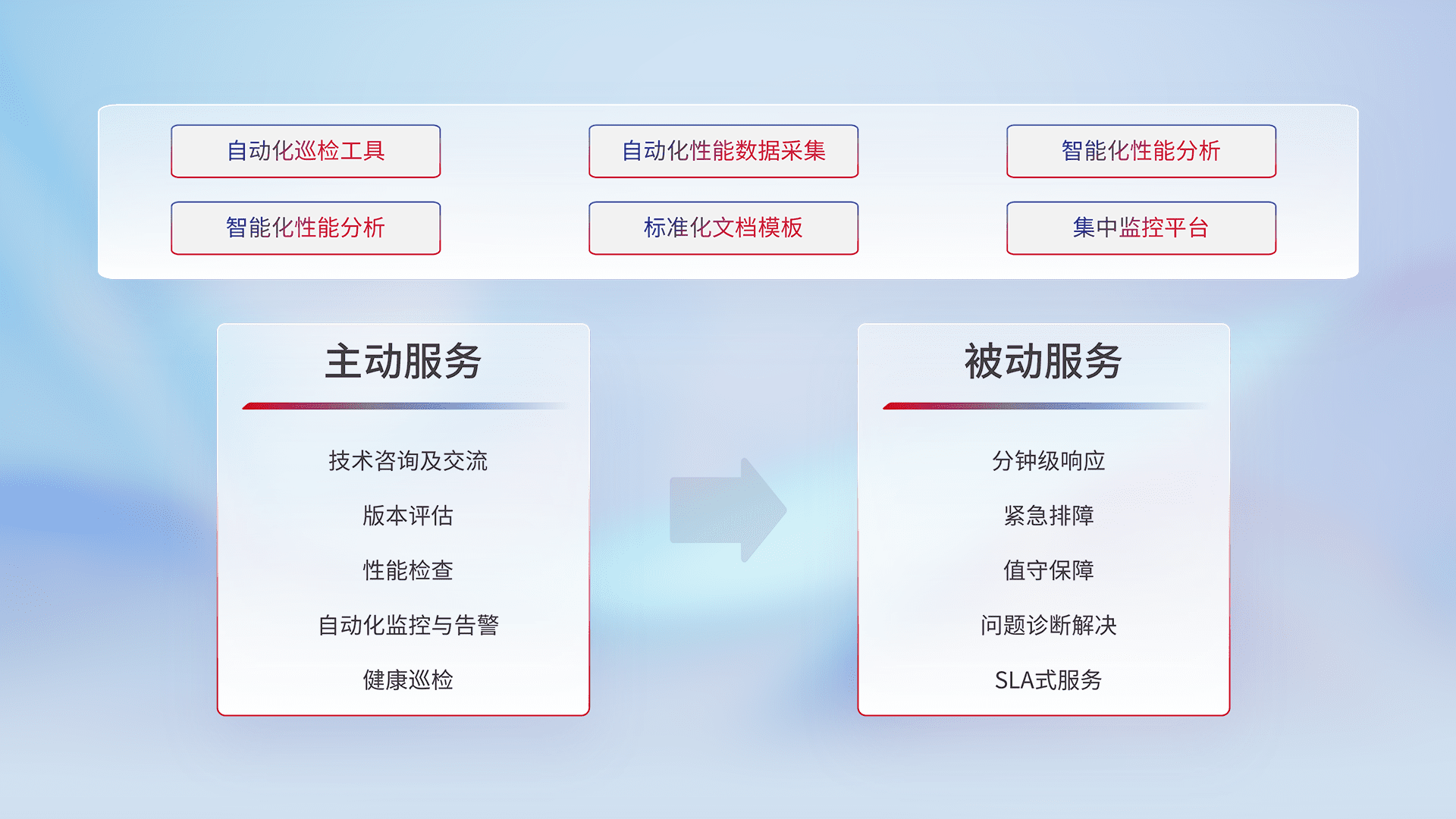智能化工具和标准化文档,,保障服务质量,,,,提供主动服务(包含技术咨询、、版本评估、、、、性能检查、、、、自动化监控与告警、、健康巡检)和被动服务包含(分钟级响应、、、紧急排障、、值守保障、、、、问题诊断解决、、、SLA服务)。。。